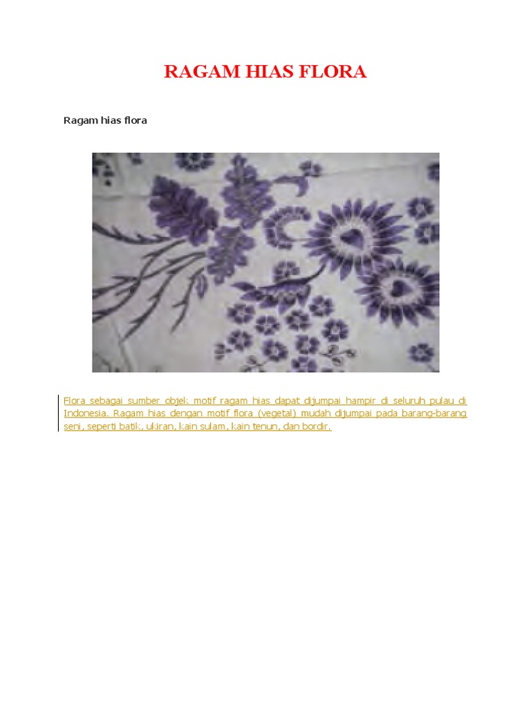 Ragam hias dengan motif flora vegetal mudah dijumpai pada barang-barang seni seperti batik ukiran kain sulam kain tenun dan brodir. Flora sebagai sumber objektif ragam hias dapat kita jumpai hampir di seluruh pulau di Indonesia. Di berbagai daerah di Indonesia ada beberapa yang Pengertian ragam hias adalah karya seni rupa yang di ambil dari bentuk-bentuk flora vegetal Fauna animal Figuran manusia dan bentuk-bentuk geometris lainnya.